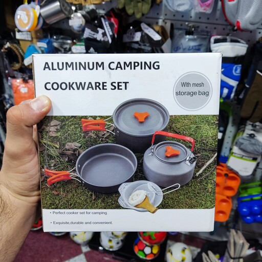 ست ظروف کوهنوردی Aluminum دارای سه تکه اصلی قابلمه، کتری و ماهیتابه، ساخته شده از جنس آلومینیوم آنادایز شده با قابلیت پخش حرارت سریع و روکش تفلونی با کفیت با شست و شوی بسیار آسان. همچنین وسایل جانبی همانند ملاقه، کاسه های پلاستیکی، سافنج و دسته چوبی در پکیج موجود هستند